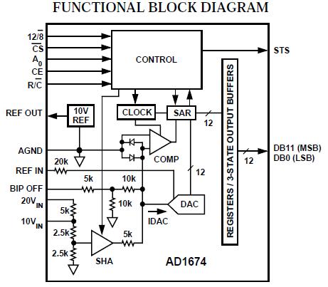 The AD1674AD is a complete, multipurpose, 12-bit analog-todigital converter, consisting of a user-transparent onboard sample-and-hold amplifier (SHA), 10 volt reference, clock and three-state output buffers for microprocessor interface. The AD1674AD is pin compatible with the industry standard AD574A and AD674A, but includes a sampling function while delivering a faster conversion rate. The on-chip SHA has a wide input bandwidth supporting 12-bit accuracy over the full Nyquist bandwidth of the converter. The AD1674AD is fully specified for ac parameters (such as S/(N+D) ratio, THD, and IMD) and dc parameters (offset, full-scale error, etc.). With both ac and dc specifications, the device is ideal for use in signal processing and traditional dc measurement applications.