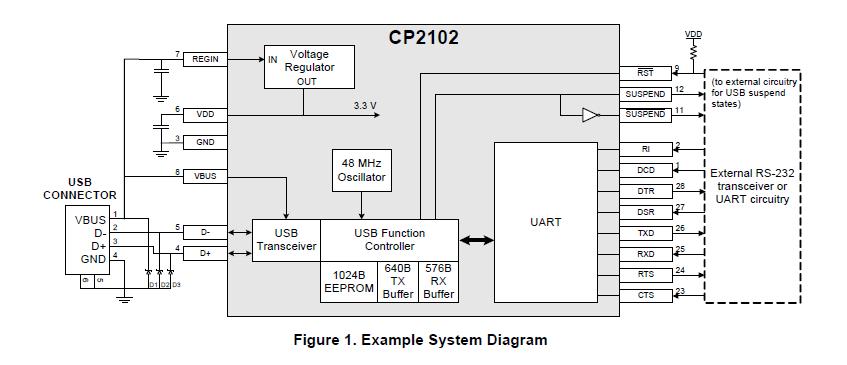 The CP2102 is a highly-integrated USB-to-UART Bridge Controller providing a simple solution for updating RS-232 designs to USB using a minimum of components and PCB space. The CP2102 includes a USB 2.0 full-speed function controller, USB transceiver, oscillator, EEPROM, and asynchronous serial data bus (UART) with full modem control signals in a compact 5 x 5 mm QFN-28 package. No other external USB components are required. The CP2102 on-chip EEPROM may be used to customize the USB Vendor ID, Product ID, Product Description String, Power Descriptor, Device Release Number, and Device Serial Number as desired for OEM applications. The CP2102 is programmed on-board via the USB, allowing the programming step to be easily integrated into the product manufacturing and testing process.
