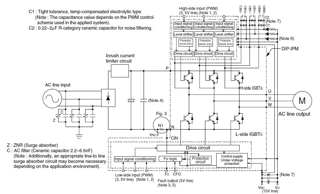 PS21869-AP features: (1)For upper-leg IGBTS: Drive circuit, High voltage isolated high-speed level shifting, Control supply under-voltage (UV) protection; (2)For lower-leg IGBTS: Drive circuit, Control supply under-voltage protection (UV), Short circuit protection (SC); (3)Fault signaling : Corresponding to an SC fault (Lower-leg IGBT) or a UV fault (Lower-side supply); (4)Input interface: 3, 5V line CMOS/TTL compatible. (High Active).